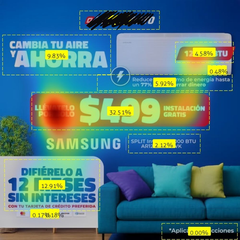 A partir de ese análisis visual predictivo, se dan indicaciones para mejorar la información, la jerarquía visual, remover o añadir elementos visuales, entre otro. Haciendo esto, en Latamclick podemos mejorar hasta un 36% la efectividad de un anuncio publicitario o de un contenido de marca. Sin correr campañas ni pruebas A/B.