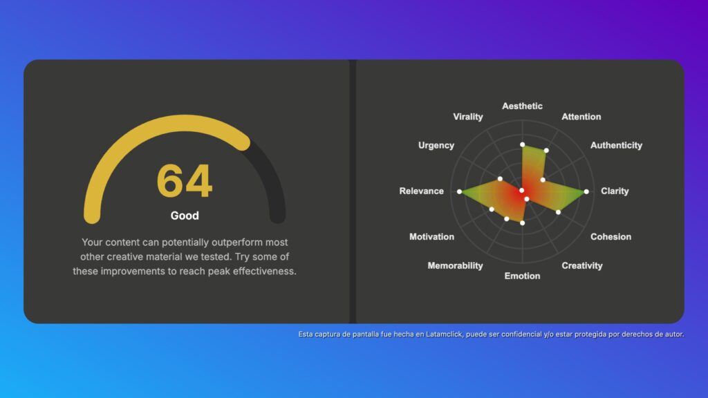 El resultado es un score creativo, calificado sobre 100 puntos, que resume el desempeño general de la pieza publicitaria.